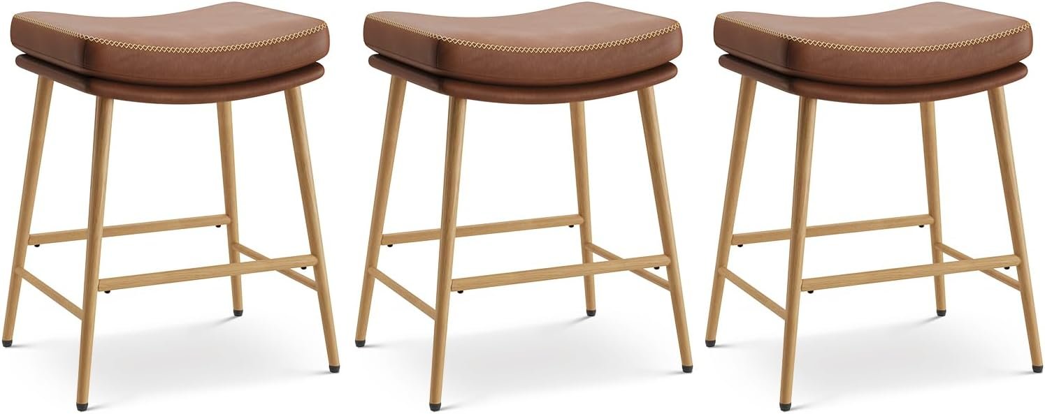 Bar Stools Set of 3, Counter Height Bar Stools with Thick PU Leather Saddle Seat & Sturdy Metal Frame Legs,Brown